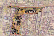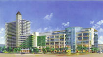 【イラスト上は、住宅棟(高層)、商業公益棟、駐車場棟で構成(完成予想図)。写真下は05年3月時点の施 行地区の概況】