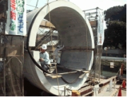 同工事(横浜市泉区上飯田403から438) は、境川沿い低地区の浸水解消を目的とした下水道整備工事の一 環。既設雨水幹線と境川を結ぶ最下流部の路線延長194.5mの工事で、戸田建設が泥土圧式推進工法で推進し た。 推進管は日本ゼニスパイプ、日本ヒューム管の工場で製作し、2分割で搬入。また、組立場所は現地の環境や 道路などの諸条件を踏まえて地上で組み立て、立坑に投入する方法を採用した。 これは従来の径3,000mm推進の枠を超えたものであり、今後の都市トンネル工事の試金石となる。シールドと 推進相互の境界を拡大して使い分けを可能とする技術の流れの中で、推進断面を拡大して全体のコスト低減を めざしたもの。 推進工事では、掘進機ターゲットのレーザー位置を中央監視室で管理し、リアルタイムで方向修正した結果、 推進精度は一次管理値であるプラスマイナス24mm以内に収まり、地上への影響もなく到達できた。また、滑材 注入は計画注入量に対して一次滑材を161%、二次滑材を332%注入。その結果、超大口径管推進でも計算推力 2万6,000KNに対して約4分の1の6,700KNの低推力で到達でき、既設シールドトンネルや地中埋設管への 影響はなかった。 そのほか、内径3,500mmの2分割RC推進管を186.0m布設したが、止水性に優れ漏水はゼロだった。また、推 進機は再利用するために組み立てやすく解体しやすいように、すべてのパーツをいんろう(凹凸)加工し、ボ ルト接合構造としたため六日間で解体搬出ができた。 同社では今後、超大口径管推進工法は、シールド工法では不経済とされる場所において雨水貯留管や雨水幹線 など、さまざまなトンネル工事に役立つものとしている。
