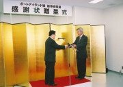 【写真上は発車式でのテープカット(中央が矢田神戸市市長)、写真下は感謝状を渡す横田社長】 発車式では、矢田市長、横田社長、斉藤審議官、近畿運輸局の谷口克己局長、神戸市の佐伯育三・市議会議長 の5名によるテープカットとクス玉開きが行われ、合図とともに紅白のテープに鋏が入れられ、クス玉が開披 されると見守っていた関係者から大きな拍手が湧き起こった。 一方、開通式典に先立ち午前10時30分から、施工者はじめ工事関係者に対する感謝状の贈呈式が執り行われ た。贈呈式では、神戸新交通会社の横田社長が、2002年2月の工事着工から今日までの各社の努力に対し謝辞 を述べるとともに、開業後は「安全で快適なサービスを提供し、市民に親しまれるよう努力していく」と挨拶 した後、施工72者を代表して川崎重工の服部明・車両カンパニーバイスプレジデントに賞状を手渡した。 ポートライナー延伸部は、既存の市民広場駅から分岐して神戸空港に至る延長4.4kmの区間。海上部の橋梁区 間(1.2km)をはじめ全線高架構造で、先端医療センター前駅、ポートアイランド南駅、神戸空港駅の三駅を 新設。併せて中公園駅から市民広場駅までの1.1kmの複線化工事も行われた。工事は02年2月に着工した。総 事業費は約520億円。 《記念行事続々と》 なお、延伸部の開業を記念したスタンプラリー「ぐるっとポーアイ」が18日・19日の2日間空港駅を起点に開 催されるほか、延伸線開業までの「あゆみ展」が4月9日まで、空港駅で開催されている。また、4日と5日 に続き11日にも市民を対象とした空港見学会が開催される。