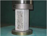 【写真上はボス供試体の圧縮強度試験、図下はボス供試体の概念図】