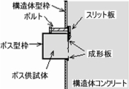 戸田建設(株)(加藤久郎社長)は独立行政法人土木研究所(坂本忠彦理事 長)と共同で、2002年度から構造物のコンクリート強度を直接調べる方法とし て「ボス供試体を用いたコンクリート構造物の品質検査方法」の研究を進めて いたが、このほど実用化にめどをつけた。 《土木研究所と共同研究、実用化にめど》 ボス供試体による強度試験方法は、コンクリート打設前にコンクリート構造物 の型枠に、あらかじめボス型枠を取り付けておき、構造物の型枠にコンクリー トが打設されると同時にボス型枠にもコンクリートが充填され、凸部状の角柱 供試体が整形される。このボス供試体を所定の管理日にコンクリート構造物か ら採取し、圧縮強度試験によってコンクリート強度を確認するもの。 構造物から採取したボス供試体は、加圧面を研磨しないでそのまま圧縮強度試 験をすることができる。また、材齢1日から任意の材齢で強度を求められるこ とが確認されている。実大施工試験及び現場適用実験で、コア供試体の強度と ボス供試体の強度を比較したが、両者の強度は非常に相関性が高く、コンクリ ート構造物からコア供試体を採取しなくても、ボス供試体により構造物そのも のの強度を得ることができる。