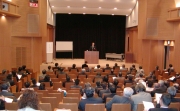 【写真上は講演会の様子、写真下は講演する谷岡学長】