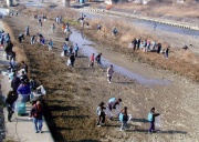 水質改善へ「大和川・石川クリーン作戦」過去最高の1万8,400人が参加 大和川・石川流域の水質改善を目指した府下最大の一斉大清掃「大和川・石 川クリーン作戦」が5日、関係13市町村による九会場で催された。同クリー ン作戦は、市民の河川美化や愛護の意識向上を目的に1997年から3月第1日 曜日に毎年開催しているもの。今年の参加者は約1万8,400人と昨年(約1万 8,000人)を上回る過去最高を記録し、2tダンプトラック130台分、約260tの ゴミを回収した(昨年は140台分、280t)。メイン会場になった富田林市に は、国土交通省の北側一雄大臣、近畿地方整備局の藤本貴也局長、大阪府の 太田房江知事、富田林市の多田利喜市町らが出席。 大和川の水質悪化は、大和平野全域で宅地開発が行われた結果、都市化によ り排水が河川に集中。現在、流域から排出される汚濁負荷量のうち80%以上 が家庭から排出される生活排水と言われている。BOD(水質値)でみる水 質が最悪だったのは1970年ごろ。21.4?/Lという劣悪な時期もあり、全国 の一級河川水質ランキングでワースト1位、2位が続いた。その後、下水道 の普及とともに水質は徐々に改善され、2003年では10年前に比べてほぼ半減 した。2005年の水質は、下流部(大阪府側)では過去最良の2004年のBOD (4.6?/L)とほぼ同等であったが、上流部(奈良県側)で2004年を上回っ た結果、平成17年の本川八地点のBODも6.4?/Lと、2004年に比べて高く なった。