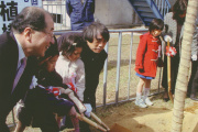 【写真上:保育園児らと共に桜の苗木に土をかける安藤氏、藤本局長/写真下:安藤忠雄氏】