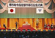 市民ら1,200人出席し記念式典 全国で15番目、近畿では四番目の政令指定都市となった堺市は1日、堺市民会 館大ホールで記念式典を開催した。14時から始まった式典には、木原敬介市長 をはじめ山崎力・総務副大臣、北側一雄・国土交通大臣、太田房江・大阪府知 事らの来賓、市関係者、そして市民ら約1,200人が出席し、政令指定都市・堺 の誕生を祝福した。
