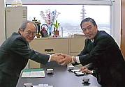 【写真:両手でがっちりと握手する檜垣局長と多山社長(右】