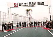 《式典には北側国交相、谷口道路局長ら約350人出席》 供用開始に先立ち、10時から現地の郡山南ICの高架部分で開催された開通式典には、国土交通省の北側一雄 大臣、道路局の谷口博昭局長、近畿地方整備局の藤本貴也局長、奈良国道事務所の山田哲也所長のほか、奈良 県の柿本善也知事、奈良市の藤原昭市長(京奈和自動車道整備促進期成同盟会会長)ら関係自治体、さらに地 元関係者や施工者など約350人が出席。 はじめに主催者を代表して近畿地方整備局の藤本局長が「大和区間は地域の均衡ある発展へ、早期完成を目指 して1995年度から整備を進めてきた。近畿圏の高規格幹線道路のネットワークを形成するもの。貴重な用地を 提供していただいた地権者に対して心から感謝申し上げる」とした式辞を述べた後、「今後も安全で豊かな暮 らしに資する道路整備を着実に進めていくためには、道路財源の確保が重要である」と改めて強調した。引き 続いて国土交通省の北側大臣が「観光立国を目指している我が国としても、奈良県での開通の意義は大きい。 国道24号の慢性的な交通渋滞の解消、地域の経済発展など、豊かな環境資源を生かした地域の活性化に大きく 寄与するものと確信している」と述べた。さらには地元・奈良県の柿本知事が「待望の開通を迎え、いま感無 量。関係者の努力が実り、感謝したい。しかし、今回はまだ出発点であり、一つの区切り。関西の大環状道路 の整備に向けて、今後は第2ステージに入る」と、大和区間の開通を喜ぶとともに京奈和自動車道の全線完成 に向けて新たな決意を示した。 《西名阪と大和高田BPを4車線で結ぶ》 この後、北側大臣、谷口道路局長、藤本近畿整備局長、柿本知事ら12人で紅白のテープにハサミを、同時に関 係自治体らの代表16人がくす玉を割り、引き続いて橿原北ICまでパレードを行って出席者一同、開通を喜び 合った。京奈和自動車道は、大和平野を南北に縦貫して京都と和歌山を結ぶ延長約120?の高規格幹線道路。 広域的には、既存の高速道路や主要な国道と連携することで相互のネットワークを形成し、近畿大都市圏の時 間短縮、京都、奈良、和歌山の拠点都市の連携強化を図るのがねらい。大和・御所道路は、大和区間と御所区 間で構成される延長約27?。そのうち、大和区間(大和郡山市伊豆七条町から奈良県橿原市新堂町)は約13.8 ?で、西名阪JCTで西名阪自動車道、郡山南IC・三宅IC・田原本IC・橿原北ICで国道24号、橿原・ 大和高田ICで国道24号と大和高田バイパスにそれぞれ連結する。標準幅員は38m、4車線。高架部分は毎時 100?(第1種2級)、平面部分は毎時60?(第3種2級)。 今回開通によって、郡山ICから新堂交差点(大和高田バイパス)の平均所要時間は、大和区間を利用した場 合、約13分となり、現在の国道24号を利用した場合の約40分に比べて、約3分の1と大幅に時間短縮を実現。 その経済効果は年間約65億円と予測されている。工事に際しても、コスト縮減でPC合成桁(PCタイプ)の 適用(PCコンポ橋)で約9億円、機能分離型支承の採用で約3億円、さらに現場内での建設発生土の有効利 用、コンクリート2次製品の活用、鋼橋の少数桁などを採用するなど、大きな成果を収めている。 なお、4月22日には「五條道路」の五條北ICから五條IC間4.5?、27日には「橋本道路」の橋本ICから 高野口IC間5.6?がそれぞれ開通する。今回の「大和区間」とあわせて、今後の京奈和自動車道の整備促進 に向けて大きな弾みをつけそうだ。