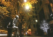 【写真:美しい照明で夜でも銀杏や彫刻が鮮やかに...】 実験では、仮設の歩道照明を設置し、「歩道の明るさ、演色性(色が自然光と同じように見える性質)の向 上」、「銀杏、彫刻、建物へのスポット照明により、にぎわいのある空間の演出」を試行した。 まず、歩道の明るさと演色性では、既存の歩道照明が高い位置にあるため、銀杏の葉に遮られて路面まで光り が届かなかったことから、実験では位置を下げ下方配光にすることにより明るさを向上させた。これによって 明るさが普段よりも2.4から4.7倍にアップし、アンケート調査では「安全」「明るい」と高い評価を得た。ま た、演色性についても高演色のランプに変更したことにより、「肌や洋服の色がきれいに見える」と好印象を 得た(実験前3.2→実験中4.1に向上)。にぎわいのある空間の演出では、鉛直面の輝度を向上させ、週ごとに フィルターの色を変色させることにより、夜間の歩道空間のにぎわいを演出した。実験の結果、「銀杏や彫刻 がよく見える」「美しい」と感じる人が多く、彫刻では白色(フィルターなし)や黄色の照明色に人気が集ま った。 このほか銀杏にスポット照明をあて、週ごとにフィルターの色を変化させた実験では、緑葉期は黄色、黄葉期 は白色(フィルターなし)に、また、彫刻(御堂筋に27体設置)の演出では存在感を際立たせるために歩道面 照度より明るい(200ルックス、約10倍)スポット照明を設置した結果、白色(フィルターなし)の照明色が それぞれ高い評価を得た。