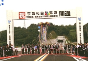 開通式典は、五條道路の五條IC(五條市釜窪町地先)で催され、国土交通省の関係者、来賓、地元自治体、 施工者ら約240人が出席。冒頭、近畿地方整備局の藤本貴也局長が式辞の中で、「都市の防災化や電線の地中 化を図り、地域の活性化に資する安全で豊かな道路整備を目指している。今回の開通も貴重な土地を提供して いただいた地権者、また、地元関係者のご協力のお陰で無事開通させることができた」と感謝の意を表した。 引き続いて石田真敏・国土交通大臣政務官が「今回の開通は、和歌山県と奈良県を結ぶはじめての京奈和自動 車であり、両県の地域産業の発展、観光資源を生かした街づくりに大きく寄与するものと確信している。今後 も国民のニーズに応えていくためにも、道路特定財源の確保を目指し、必要な道路整備を着実に推進していき たい」とあいさつした。来賓祝辞では、奈良県の柿本善也知事が「相次ぐ京奈和自動車道の開通で、地域の距 離感覚が変わってきた。道路はつながってこそ値打ちがある。また、皆さんもしっかり使ってほしい」、和歌 山県の木村良樹知事の代理として出席した小佐田昌計副知事が「関西が一つになるためにも、道路整備は重要 な課題。他府県とも一層連携を図って、京奈和自動車道の早期全線開通を願っている」と喜びを語った。この 後、来賓、関係者が紅白のテープにハサミを、また同時にくす玉を割り、さらに五條市と橋本市の児童が色と りどりの風船を飛ばして待望の開通を祝い、五條ICから橋本東IC間をパレードした。 京奈和自動車道は、大和平野を南北に縦貫し、京都・奈良・和歌山を結ぶ総延長約120?の高規格幹線道路。 第2名神、西名阪自動車道、阪和自動車道、南阪奈道路などと連結し、相互の広域的なネットワークを形成す る。五條道路は五條市居傳町と同市畑田町(和歌山県境)を結ぶ延長7.9?。今回の開通は3.4?(暫定2車 線)で、4月22日に開通した五條北ICから五條IC間を含め五條道路は全線開通。橋本道路は和歌山県橋本 市隅田町(奈良県境)と同市高野口町を結ぶ延長11.3?。今回の開通は0.8?、4月27日には橋本ICから高 野口IC間(暫定2車線)5.6?が開通している。五條道路・橋本道路とも標準幅員は22.0m、第1種2級の毎 時100?の設計速度。 今回の開通によって時間短縮による経済効果は年間約70億円と予想されている。