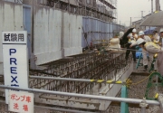 PREX工法は型枠、床版、高欄を現場の施工・優先条件などに応じて適応カ所を選択できるのも特徴。型枠 は水セメント比30%の高強度モルタルにファイバーを2.5%混入したプレキャスト埋設型枠で、高耐久性能を 持つ。床版はプレストレスを導入したハーフプレキャストスラブ、無支保化施工ができ、スパン八?程度の長 スパンまで対応。高欄は状況に応じて、高欄単体と張り出しスラブを一体化したL型を選択できる。 同工法が適用されている久宝寺工区(高架橋区間419m、盛土区間142m)で高架橋新設工事を施すというもの。 1時間あたり上下24本の列車が通過するなど苛酷な施工条件のため、作業の効率化や安全性の確保などを目的 にPREX工法の採用を決めた。ラーメン高架橋の張り出し・高欄部、スラブに適用し、柱と梁は在来工法と なっている。 PREXスラブの本格的な適用は同工区が初めてで、ループ継手内鉄筋を用いている。また、ハンチの省略に よる施工の合理化も可能とした。同工区では工期短縮を図るために梁のコンクリート打設前にPREXスラブ の架設を行い、梁とコンクリートを一回で打設する方法を採った。高欄については高欄と張り出し部を一体化 したL型を適用している。現場ではラーメン高架橋のスラブ、高欄の架設を3月から進めており、9月に同工 法を完了させる。同工区高架橋新設工事は2002年4月23日に着工され、2007年2月23日の竣工予定。現時点で の進捗率は72.9%。 同工法の施工現場見学会が22日にJR久宝寺作業所で開かれた。冒頭、横沢和夫同社技術本部技術研究所長が 挨拶に立ち、「PREX工法は生産性を上げる工法。生産性を上げることで現場でのコスト削減をめざした い」といい、松本和久作業所所長は「大阪外環状線が1日でも早く完成できるよう、急速施工できるPREX 工法を普及していきたい」と話した。