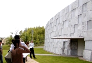 最初に訪れた筑紫の丘斎場は、揖南衛生施設一部事務組合(現・揖龍保健衛生施設事務組合)が2001年7月に 着工、2003年3月に竣工したもので、RC一部S造平屋建て、敷地面積1万2,657.57?、建築面積2,770.57 ?、延べ面積2,314.58?の規模。設計は(株)遠藤秀平建築研究所、施工は清水建設(株)が担当した。 学生らは、当時の所長を務めた前田一郎・清水建設第3営業本部営業部副部長の説明に耳を傾けながら玄関、 告別室、炉前ホール、ウッドデッキなどを見て回った。内部のコンクリート壁には型枠にリブラスを、天井に はエキスパンドメタルを使用しているが、これについて「内部壁については実証例が一つもなかったため、実 物大モデルで実験するなど、非常に苦労した。天井のコンクリート打設では一面がモルタルの海になったこと も。現場で職人さん達と試行錯誤を重ねて作り上げた建物は、建築物というより手作りのコンクリート工芸 品」と当時を振り返る前田副部長の話を聞きながら、学生らは熱心にメモをとるなどしていた。 午後からは、神戸東部新都心(HAT神戸)に位置し、兵庫県・神戸市が整備を進めた兵庫県立美術館・なぎ さ公園を訪問した。阪神・淡路大震災からの「文化の復興」のシンボルとして14年4月に開館した兵庫県立 美術館は、常設展や企画展が催される展示棟と、ギャラリー、ミュージアムホールを有するギャラリー棟で構 成され、SRC造地下一階地上四階建て、敷地面積1万9,000?、建築面積1万2,807.71?、延床面積2万 7,461.41?の規模を有する。設計は安藤忠雄建築研究所、施工(建築)担当は大林・清水・鴻池・神鋼興産建 設・明和・山田JV。 副所長を当時務めた大林組の都竹修・神戸支店建築工事部専任役から「設計者の描いたデザインを具現化する のが施工者の役割。施工側にも回ってほしいが将来皆さんが設計者となった時は、施工上のポイントも理解し た上で仕事を進めてほしい」とする話を聞きながら学生らは館内や緑の庭、象徴的な円形テラスなどを見学 し、カメラのシャッターを切っていた。