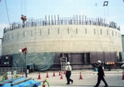 この後、JVの前田氏らの案内で参加者は現場敷地内に入り、ケーソンの周囲に設置された掘削揚土機や水中 掘削機支援機などを説明を受けながら見学した。このケーソンは外径が35m、内径が30m、沈設深さ46.2mとい う国内最大のもので、現在は全体八プロット(約42.5m)のうち七プロット(約36.6m)のコンクリート構築が 完了している。完成後の貯留量は1万9,400立方mとなる。 引き続き、コンクリート構築が進むケーソンの上部へと移動し、水が貯留されているケーソンの内部ととも に、足場の解体が行われている現場を見て回った。 今回の「自動化オープンケーソン工法」は、大別すると自動掘削揚土システムと自動沈設管理システムで構 成。自動掘削揚土システムは、ケーソン内壁円周に設置した走行レール上を水平方向に移動しながらケーソン 刃先部を自動掘削するバックホウ型の自動水中掘削機と、それにより掘削された土砂の揚土及びケーソン中央 部(自動水中掘削機で掘削できない中央部分)の掘削と揚土を行う掘削揚土機で構成されている。また、自動 沈設管理システムは、従来型の圧入オープンケーソン工法の手動による圧入ジャッキ操作を、ケーソン躯体に 設置した各種計測器データを自動管理することにより圧入沈設を行うシステムで、迅速かつ的確な圧入ジャッ キ操作を可能にし、沈設精度の向上と沈設作業の合理化を図ったもの。 また、JVでは今回の工事で契約後にVE提案。このVE提案では、水中コンクリート内に応力材として、鋼 殻桁を設置することで水中コンクリートの厚さを薄くし、ケーソン本体の深さも浅くすることが可能となる。 さらに、鋼殻桁を格子状にすることで、制限されているコンクリートの打設量にも対応できるようになった。 今回の工事は、寺畑前川の最上流部に調節池を設け、豪雨時に増水した河川の雨水を取水施設(横越流堰)か ら地下の導水路を経て調節池に流し込み一時的に貯留し、さらに、越流堰下流部の河床を切り下げることで流 下能力を増大させ、豪雨による水害を防止しようとするもの。工期は2007年3月25日までで、現在の工事の進 捗率は約70%となっている。