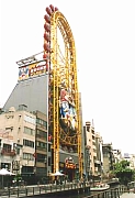 「水の都・大阪」を代表する河川であり、都心南部に残された貴重な水辺空間でもある 道頓堀川沿いの都市景観に、斬新な観覧車を擁する大型量販店ビルが新風を吹き込み、 地域の活性化にも寄与している。昨年3月にオープンした「ドン・キホーテ道頓堀店」 がそれで、壁面に設置された楕円形型観覧車が都市景観に強いインパクトを与えてい る。「えびすタワー」とネーミングされたこの観覧車は、全長77.4m、全幅32mで、ゴン ドラが常にレールの外側を回る「超低速ジェットコースター」の採用や「内部ゴンドラ の水平回転」など、様々な工夫が凝らされている?人気スポット?。エキサイティング でシュールなまち・道頓堀の風物として溶け込み、道行く人々から親しまれ続けてい く。