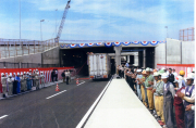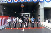 【写真下】関係者が見守る中での通り初め 開通式は午前10時から幹線道路上で開催された。初めに施主を代表して平野副社長が挨拶。平野副社長は、 「主要施設が隣接する区域での難しい工事となったが、慎重に工事を進めていただき、知恵と尽力により工期 短縮とコスト縮減が達成できた。今後も安全確保と環境に配慮しながら残りの工事を進めてほしい」と述べ、 開通を喜んだ。 来賓祝辞では、関西国際空港貨物地区連絡協議会の中島幸典副会長が、「関空の貨物施設は上屋の増設が進む など急ピッチで整備が行われているが、今回の開通は貨物車両の増加に対応し、安全で円滑な輸送に寄与する ものだ」と期待を寄せた。 この後、平野副社長と中島副会長、関西国際空港用地造成会社の古土井光昭専務、関空会社の島田知明常務、 関西空港警察署の辻野賢次署長、大林組の本庄正史専務執行役員の6氏によるテープカットが行われた。 合図とともに紅白のテープにハサミが入れられるとクス玉が開披され、見守っていた出席者らから大きな拍手 が沸き起こった。テープカット終了後はトラックによる通り初めが行われた。なお、午後1時からは一般車両 の通行が開始された。 アンダーパス工事は、地下に道路部の躯体を構築し、その上を頂版として幅60?、長さ60?のPC版で覆うも の。昨年6月から行われた工事では、掘削土量約13万立方?、躯体コンクリート約45,000立方?を打設。また PC版は662本を製作・設置した。 大林JVの猪坂益典所長は、「躯体コンクリートの打設が日量2,000立方?に達する時期もあり一番のポイン トだったが、今はとにかくほっとしている。残る工事も含め最後まで無事故・無災害を目指して努力してい く」と話していた。