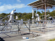 1・2級の83人が挑戦 合格めざして真剣に 近畿建設躯体工業協同組合(山本正憲理事長)は8日と9日の二日間にわた り、兵庫県三田市の三田建設技能研修センターで厚生労働省が認定する国家検 定の「平成18年度とび技能検定実技試験」を実施した。 今回は2日間で1級が72人、2級が11人の合計83人(昨年は99人)が受験し、 真夏の太陽が照りつける中、晴れの合格をめざして各課題に取り組んでいた。
