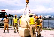 〜大建協は堤防応急復旧に参加〜 当日はまず8時30分から第1部として、河田惠昭・京都大学防災研究所所長の解説で地震発生から津波警報発 令中の訓練が行われた。同訓練では、気象庁が発表する関係機関や自治体への津波情報伝達から始まり、水門 閉鎖訓練・広報活動・海面監視、船舶・沿岸利用者への避難広報訓練、住民避難訓練、広域情報収集訓練、船 舶避難訓練を実施した。この後、10時から開会式が行われ、北側一雄・国土交通大臣、太田房江・大阪府知 事、木原敬介・堺市長がそれぞれ挨拶した。 この中で北側大臣は、江戸時代に大阪で発生した安政の大地震による津波被害を示しながら「津波の怖さや被 害の悲惨さを風化させることなく、後世に伝承していかなければならない」と指摘。そして、自助・公助・協 助の必要性を述べるとともに、関係者の一層の連携強化を呼びかけた。また、太田知事も住民一人ひとりの防 災に対する意識の高揚を訴えながら「この訓練が防災の重要性を考える機会になれば」と訓練の成果に期待し た。 引き続き、第2部として津波警報解除後の訓練を実施。ここでは、オフロードバイクや船舶、ヘリコプターに よる被害状況調査に続き、緊急交通路確保訓練、倒壊家屋や事故車両からの救出救助訓練、消火活動訓練、海 上漂流者救助訓練、応急救護所設置、救護救急活動訓練、堤防応急訓練、さらに緊急物資輸送訓練などが行わ れた。 このうち、大建協では被災した堤防に大型土のうを設置する「堤防応急復旧」に参加。大建協の横断幕を付け た12トントレーラーによって運び込まれた重さ1トンの土のうを、クレーンを使って設置場所まで移動させ、 待機していた作業員が堤防に見立てて手際よく積み上げていった。ちなみに、訓練に参加した作業員四人と運 転手3人の合計7人はいずれも会員企業の従業員。また、訓練を視察した淺沼健一会長も迅速に行われる作業 を熱心に見入っていた。 このほか、会場内には展示・体験コーナーとして災害対策車両や地震体験車、各機関の地震や津波に対する取 り組みを紹介したブースなども設置された。なお、当日は親子連れをはじめ一般の人々も多数が見学に訪れ、 本番さながらの訓練のようすを真剣な表情で見るなど防災意識の高まりを感じさせた。
