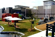 完成記念式典・テープカットで祝う 見て、触れて学ぶー。大阪府が水道事業への関心を深めて貰おうと庭窪浄水場 で整備を進めていた「大阪府水道見学施設」(大阪府守口市大庭町2-30-18) がこのほど完成、9月30日に完成記念式典が開催された。広場はじめ展示施設 で構成されるもので、式典には芝池幸夫・水道企業管理者らが出席してテープ カットなどが行われた。 この展示施設は、高度浄水施設の整備完了に伴い、「おいしい水」を広く府民 にPRする広報活動の一環として整備が進めれてきたもので、整備あたっては 一般から愛称やアイデアを募集していた。展示は、屋外と屋内で構成。屋外展 示は、「きらら水広場」と名付けられた芝生広場に、シーソーや手回し、自転 車こぎにより噴水を上げる「まんぱわーすんすい」や水車が回る「段段花 壇」、ウォーターガン、シンボルともなる「ししおどし時計」、浄水場の仕組 みを表した遊具などを設置。 ※写真上:きらら水広場 ※写真下:テープカット