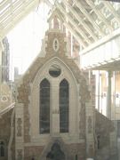 【写真】:中庭にはチャペルも 同ホテルはS(柱SRC)造地下1階地上13階塔屋1階、敷地2,268.93?、建築1877.3?、施工延べ 19,781.2?の規模。発注者はマルイト?。 英国20世紀初頭のアーツアンドクラフト様式が採用された建物は地下1階が駐車場等、1〜2階はエントラ ンス、ロビー、3階は着付け室等、4〜12階は客室、13階がスパ、ラウンジで構成され、ロンドン・ハイ ドパーク近くのセントシモンズ教会を再現したチャペルが中庭に位置するほか、和を意識した13階のスパで は、敷地内を掘削し湧き出した天然温泉が楽しめるのが特徴。 客室数は327室。敷地は旧住友銀行跡地で、1・2階外観はその石造の当時のイメージを再現する花崗岩仕 上げ、3階から13階外観はPC打込レンガタイル、石状吹付塗装。 参加者らは最終の仕上げ全般が最盛期を迎えている13階のスパ部分、12階の配管、7階客室、3階着付け 室、2階の宴会場を松岡所長の案内で見て回り、現場内をカメラで撮影するなどしていた。17年8月22日 に着工し工事は順調に進捗、工期は19年1月31日まで。3月3日にオープンする。