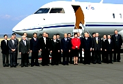 冬柴国交相が搭乗 8月2日の供用開始に向け各種検査が行われている関西国際空港の第2滑走路 での飛行検査が始まり、3日、冬柴鐵三国土交通大臣が搭乗する同省の検査機 が初着陸を行った。今月から始まる飛行検査の一環として実施されたもので、 空港会社の村山敦社長ら関係者ら、が‘一番機’の着陸を見守った。 ※写真上:感想を語る冬柴国交相 ※写真下:検査機を前に記念撮影する関係者 飛行検査は、先月29日から実施されていた新滑走路の地上施設等の検査終了を 受けて行われ、冬柴国交相が搭乗し、東京から飛来したもので、空港では空港 会社の村山社長、宮本一会長、大阪航空局の武田洋樹局長、関西経済連合会の 秋山喜久会長、大阪府の太田房江知事ら関係者が出迎えた。 検査機は11時30分過ぎに無事ランディグを果たすと見守っていた関係者から拍 手が巻き起こった。平行誘導路に到着後、タラップを降りた冬柴国交相が出迎 えた関係者一人ひとりと握手を交わし、空港会社の職員から花束が贈られた。