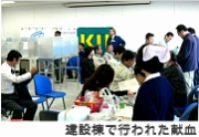 関西国際空港2期建設実施本部と関西国際空港二期建設協力会は27日、空港島 内の建設棟で献血を実施した。これは、冬場には慢性的な血液不足となること から、関西国際空港ロータリークラブとの共催で、社会貢献活動の一環として 毎年、実施しているもの。 献血は、大阪府南大阪赤十字血液センターから派遣された職員と2台の採決車 で行われ、9時30分から16時30分までに124人が献血に訪れた。既に恒例事業 となっているだけに‘常連‘も多く、その1人である関西国際空港用地造成会 社の古土井光昭専務も訪れた。