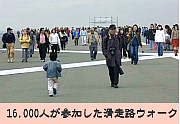 村山社長、古土井専務も完歩 ラストウォークに1万6,000人―。関西国際空港の第二滑走路ウォークが25日 に開催された。(主催・関西国際空港用地造成?、関西国際空港?、協力・関 西国際空港2期建設協力会)第二滑走路オープン記念イベント「関空スプリン グフェスタ2007」として行われたもので、親子や家族連れらが参加し、最後の 海上散歩を楽しんだ。 今年8月2日にオープンする第2滑走路を、広く一般の方々にその壮大なスケ ールを体感してもらうとともに、空港島への愛着を持ってもらうことを目的と したもの。滑走路ウォークはこれまで、「みんなで歩こう空港島」や「みんな で造ろう空港島」などの各種イベントを通して、造成中から辞しされてきた が、今回がラストとなった。 ウォークでは、滑走路4?と2期島内の滑走路行きバス乗降場までの1?を含 めた5?コースと、滑走路中央までの3?コースが設定され、参加者はそれぞ れのペースで、明石大橋や飛行機の離着陸を眺めながら記念写真などを行って いた。また、参加者に混じって、村山敦社長と用地造成会社の古土井光昭専務 もウォーキングを楽しんでいた。