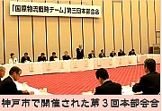 提言「関西一丸!アジアとともに更なる飛躍を」 冬柴国交相 年内にも一開港化へ 広域連携を通じて、国際競争力の強化に向けた方策を検討する国際物流戦略チ ームの第3回本部会合が今月25日、冬柴鐵三・国土交通大臣が出席して神戸市 内で開催された。国際物流の効率化を通じた関西活性化を目指し、産・学・官 が一体となって各種方策に取り組むため、全国に先駆けて設置された。関西経 済連合会はじめ、近畿地方整備局並びに兵庫県、神戸市、大阪市などの地方自 治体、大学や研究機関などで構成。今回は2007年度以降の取組をまとめた提言 2007「関西一丸!アジアとともに更なる飛躍を」を承認した。 会合では、過去2回の本部会と六回の幹事会、課題検討ワーキンググループの 行ってきた討議を基に、「港と港の連携」や「港と道路の連携」、「海港と空 港の連携」についての取組をまとめ、戦略チームの新たな提言として発表し た。