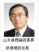 土木学会論説コラムに鉄建建設の山本会長が論文掲載 社土木学会(石井弓夫会長)は、第3回論説コラムで、山本卓朗論説委員(鉄建建設会 長)の「誇りを持って建設業を語る」と題した論文をホームページに掲載した。 同コラムは今年6月に開設したもので、土木技術者の責務として、社会基盤整備のあり 方・重要性・国際社会における我が国の貢献、地球環境・地域環境保全に対する土木技 術者の役割など、土木を取り巻く様々な問題をタイムリーにとり挙げ、「論説」として 広く社会に発信するのが目的。
