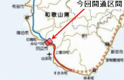 また、併せて開通するアクセス道路となる一般国道42号田辺西バイパスの一部は、南紀田辺ICから現在開 通している田辺バイパスまでをつなぐ延長0・6??の区間。 みなべIC〜南紀田辺ICの開通により、京阪神間と和歌山県南部地域(紀南地域)における高速ネットワー クの強化が図られ、東南海・南海地震発生時には一般国道42号と連携して、緊急輸送路としての役割が期待 される。 また、すでに供用中の近畿自動車道、阪和自動車道及び湯浅御坊道路と連携し、大阪・和歌山市からの時間短 縮及び夏場の一般国道42号の渋滞緩和が期待され、今回開通する区間及び田辺西バイパスを利用することに より、白良浜海水浴場まで約15分間短縮される。 さらに、同区間の開通に伴い、CO2の削減効果として約2、800?/年が見込まれ、これは約500世帯 の年間排出量に相当する。 紀南地域には恵まれた観光資源や農林・水産物(南高梅・マグロ等)が多くあり、今回の開通により高速道路 へのアクセスが向上することで、物流の効率化が図られ、地域産業の活性化及び発展が期待される。