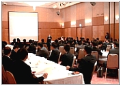 講演と情報交換など ハウジングコンサルタント業務を展開する(株)ハウジングラボ(大阪市北 区、松尾俊朗社長)では、取引先の住宅会社を一同に集めた「全国ミーティ ング」を11日、大阪市内で開催した=写真。ミーティングには全国から14社 の担当者ら約70人が参加、松尾社長による基調講演と意見交換などが行われ た。