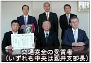 同工事は、「阪神なんば線」となる西大阪延伸線建設工事で、同JVでは、土木工事第1工区として西九条 駅から地下に新設される九条駅までの延長1,351にわたり、高架部とU型擁壁部、開削トンネルを担当。 工区には上下水道やガス、電気・通信などの地下埋設物が輻輳するため、埋設物管理者や隣接工区との事前 協議、調整はもとより、保護管理はじめ安全教育の徹底、自主点検などを確実に実施したほか、三度にわた る部会の点検でも、「実施ごとに取り組み状況が改善されていた」と評価された。 一方、交通安全優良事業場表彰は、同支部の交通対策部会(寺下部会長)と五団体本部が現場点検を実施。 表彰式では部会メンバーからの受賞理由報告の後、國井支部長が江田正敏所長らに賞状と盾を手渡した。 挨拶で國井支部長は、建設車両による交通事故は近年増加傾向にあるとし、「支部としても交通安全対策を 強化するが、受賞現場では優れた取り組みを進めており、今後はそのノウハウを水平展開し、支部の交通安 全対策が進歩することを願う」とし、寺下部会長は、「作業所が一丸となって事故防止に取組んでいる。今 後も事故防止に邁進してほしい」と述べ、最後に江田所長が、「工事終了まで公衆災害、特に交通事故防止 に取り組んでいく」と謝辞を述べ、無災害達成を誓った。 同作業所では、近畿地方整備局の行う大滝ダム地すべり対策工事を担当。押さえ盛土工法をはじめ、集排水 ボーリングや排水トンネルを施工。工事では購入土や採取土の運搬のため場外、場内において多数のダンプ トラックを運行している。 さらに現場が山間地で急勾配の多い国道を使用するため、作業所において運行ルールを策定し、新規入場前 と車両整備管理者による点検確認、写真入りKYマップによる運行経路策定などを進め、評価では、「元請 と協力会が積極的に取り組み、全体の安全意識が極めて高く、それらが日常の交通安全管理に反映されてい る」とされた。