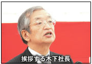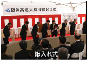 起工式で鍬入れ 阪神高速大和川線で、阪神高速道路?の主催による「合同起工式」が25日、 同社施行区間内の大阪府堺市堺区遠里小野町四丁目地内で開催された。区間 内で実施される6工区での工事着手にあたり合同で行われたもので、式典に は阪神高速?の木下博夫社長はじめ来賓、地元関係者など約140名が出席、鍬 入れなどが行われ工事の着工を祝い合った。 起工式は11時から行われ、初めに主催者を代表して木下社長が挨拶。木下社 長は、「この道路は都市再生環状道路の一部を形成し、都市圏の道路交通の 円滑化を図り、大阪ベイエリアと中部圏などと結ばれる意義深い路線だ」と 同線の役割を述べ、事業については「全国的にも注目される新しい事業手法 を企画した」とした。 その取り組みとして、スーパー堤防との一体的整備による災害に強いまちづ くり、省資源・省エネルギーとして工事の発生土の再生活用などを上げなが ら、「事業推進には関係機関の連携が不可欠であり、今後も協力をお願いす る」と支援を呼びかけた。